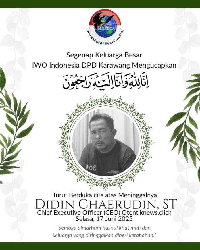 KARAWANG – BEKASIHARIINI.CLICKÂ Kabar duka menyelimuti dunia jurnalistik di Karawang. Wartawan senior sekaligus Chief Executive Officer (CEO) Otentiknews.click, Didin Chaerudin, ST, wafat pada Selasa, 17 Juni 2025. Almarhum menghembuskan napas terakhirnya di Rumah Sakit Umum Daerah (RSUD) Karawang setelah menjalani perawatan akibat kondisi kesehatan yang menurun.