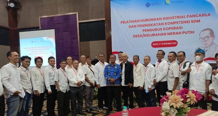 KOTA BEKASI | Bekasihariini.click – Kepala Dinas Koperasi UKM Kota dan Kabupaten Bekasi bersama Kementerian Koperasi dan UKM RI secara resmi membuka kegiatan Pelatihan Hubungan Industrial Pancasila dan Peningkatan Kompetensi SDM Koperasi Desa/Kelurahan Merah Putih, Senin (17/11/2025). Kegiatan ini digelar selama tiga hari, dari 17 hingga 19 November 2025, dan bertujuan memperkuat kapasitas pengurus serta pengawas koperasi dalam memahami prinsip hubungan kerja yang berlandaskan nilai-nilai Pancasila.
