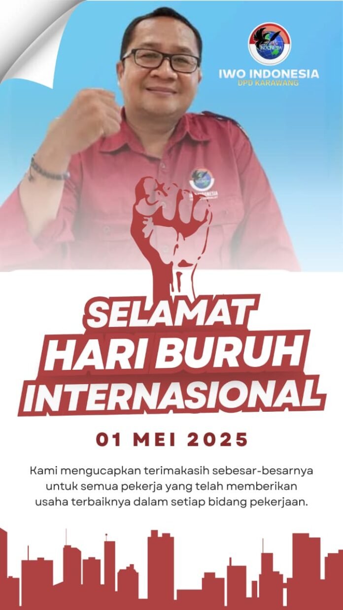 Karawang, | BEKASIHARIINI.CLICK | – Ketua Ikatan Wartawan Online Indonesia (IWOI) Dewan Pimpinan Daerah (DPD) Karawang, Syuhada Wisastra, menyampaikan ucapan Selamat Hari Buruh Internasional kepada seluruh pekerja dan buruh di Indonesia, khususnya di Kabupaten Karawang. Kamis 01 Mei 2025.